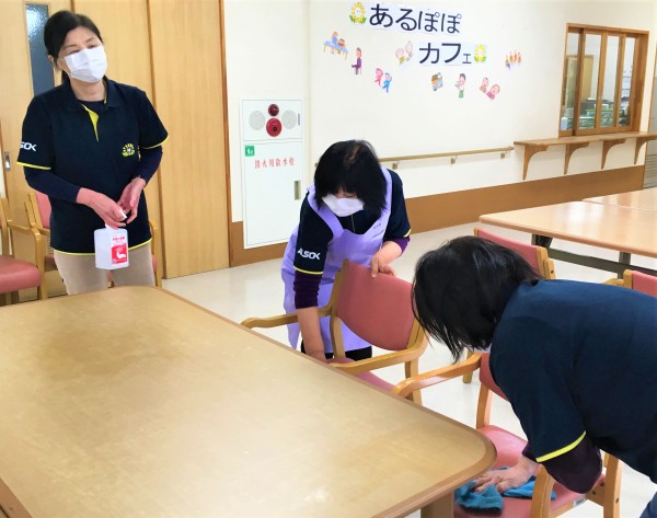 リーダーKが消毒作業をしていると、それを見ていたスタッフが集まってきました。