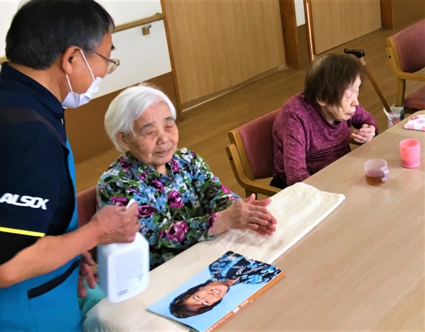 今回は物を消毒するのにアルコールを使っている様子をご紹介しましたが、普段は入居者様に手を消毒していただくのに使用しています(*^^)v