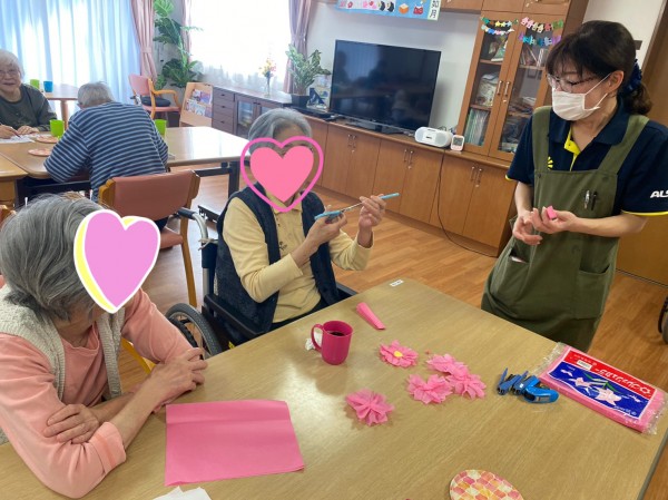 『春が待ち遠しいわ♬』と、スタッフと一緒にお花紙で『さくら』を制作される方♡ など今日も活気あふれる二階フロアの皆様のご様子でした。 手指を沢山使い、集中力も高まりましたね。季節を感じる事も大事ですね(^。^)