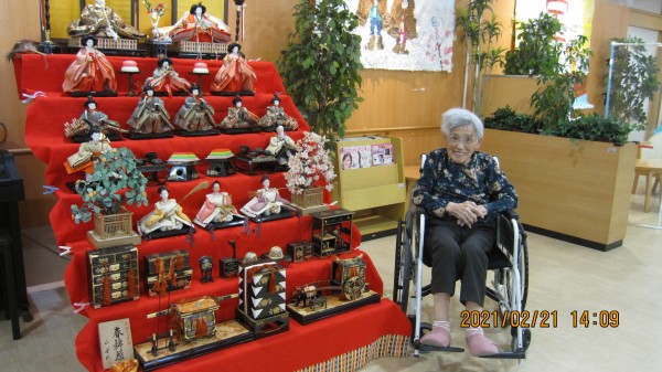 「すこや家 西東京」の ひな人形の前にはまだまだご入居者様が集まってきていただいております。