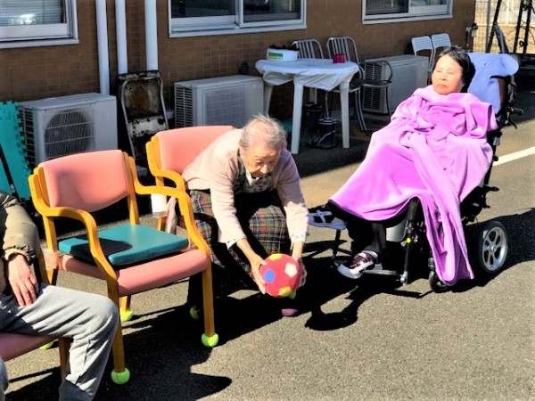 「寒いからボールを使って体を動かしましょう」とボーリングを行いました。