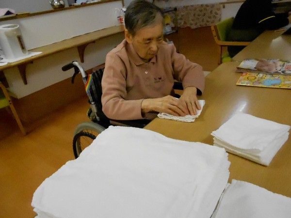 本日1階ではタオルたたみをお手伝いしてくださるN様とN様とK様! 『これこっちに置いて〜』 『端と端上手くできない…』 など会話されていました。