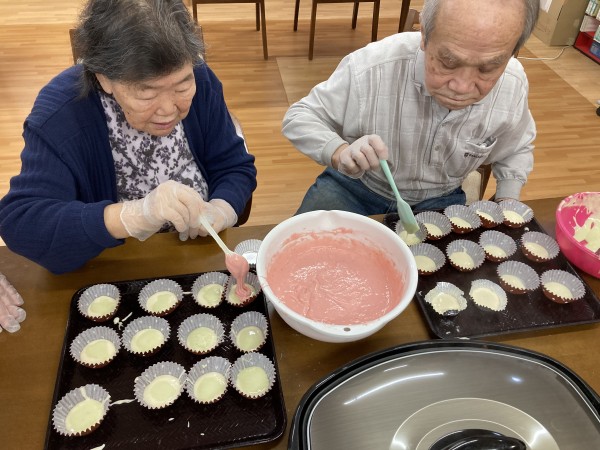 先日、ご入居者様と三色蒸しパンを作りました。