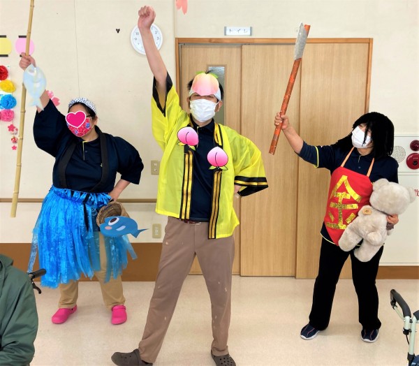 三太郎が揃うと、控室で練習していたダンス『日本昔話ヒーローズ』が始まります。