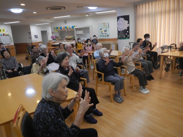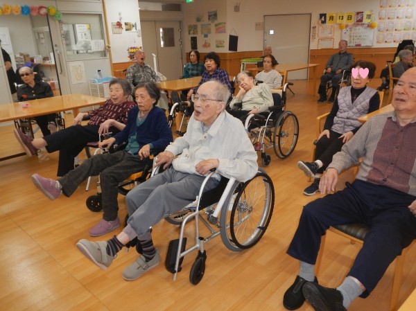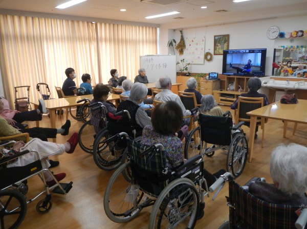 運動トレーナーの生配信の画像に合わせ、みなさん元気良く声を出しながら、体を動かされていました。