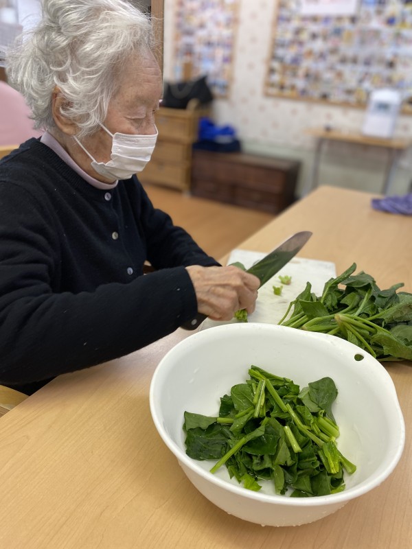 ご自宅ではなかなかこの様な人数の食事を作る事はありませんが、かたくりのご利用者様方は次々と野菜を切って下さり料理を完成させていきます。