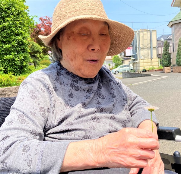 しばらくお花の鑑賞を楽しまれたI様でしたが、マーガレットを一輪だけ摘まれるとお隣のS様へ「はい、どうぞ」とプレゼントされました。