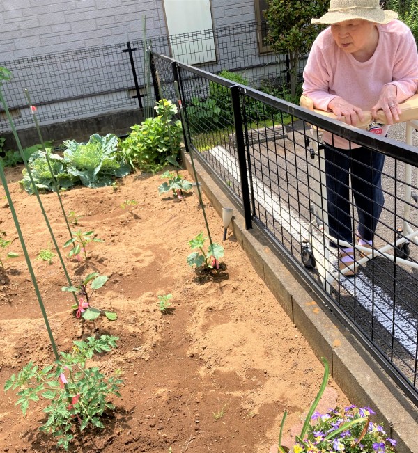 その中でもひと際立派に成長した苗が目についたようで、こちらもすぐに「トマトが成ってるじゃない!」と反応されていました。