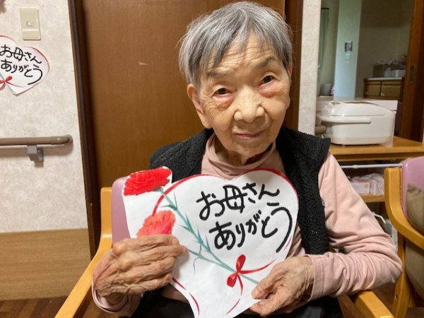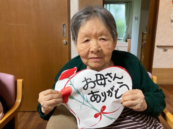 前回のブログの続きで母の日のお祝い(中編)をご報告させて頂きます。当日(13日)はご利用者様全員お元気になりましたので、昼食後のレクの一環として、母の日のイベントにしました。スタッフからプレゼントを渡し、笑顔が見られスタッフ一同嬉しい気持ちになりました。
