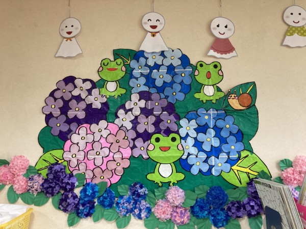 今月の貼り絵のテーマは6月ということで梅雨!カエルと一緒にてるてる坊主も合唱しています(^^♪