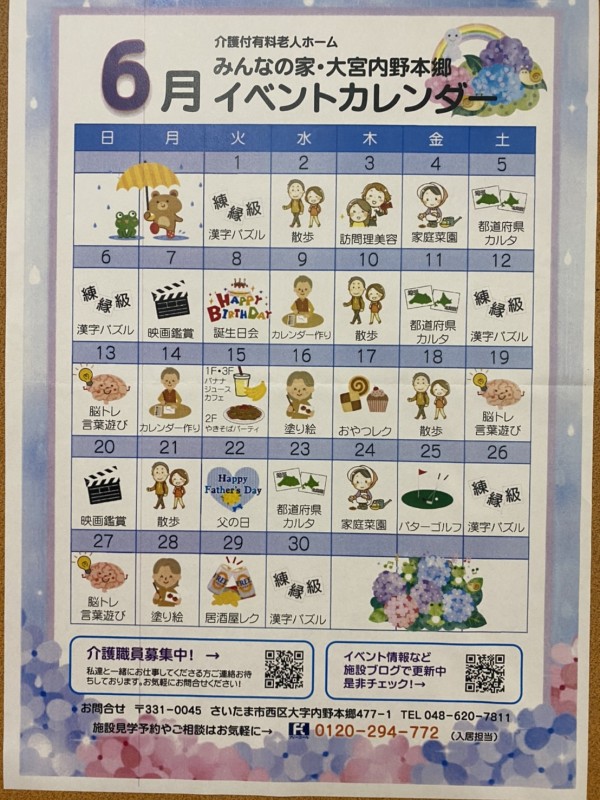 6月のイベントカレンダーを掲載させて頂きます。入居者様方が少しでも明るい気持ちで過ごして頂けるよう、スタッフ一同力を合わせて盛り上げていく所存です(^。^)