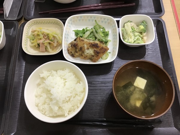 本日のメニューは白身魚の香草焼、エビとブロッコリーのサラダ、ハムと白菜のソテー、お味噌、ご飯となっております。