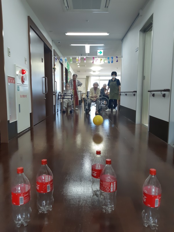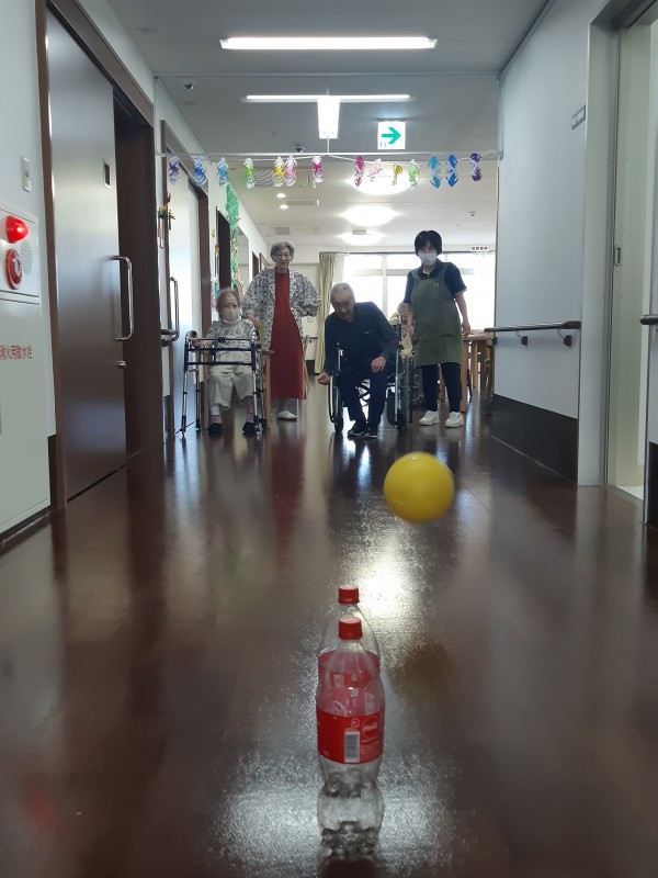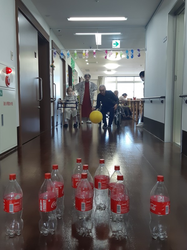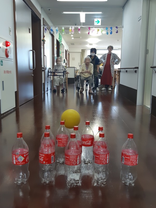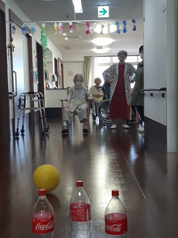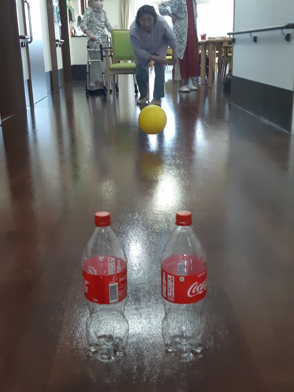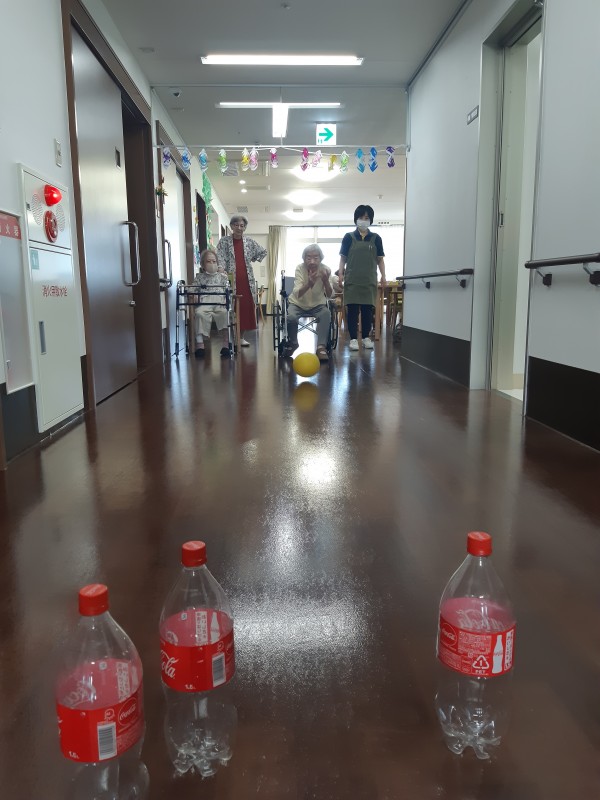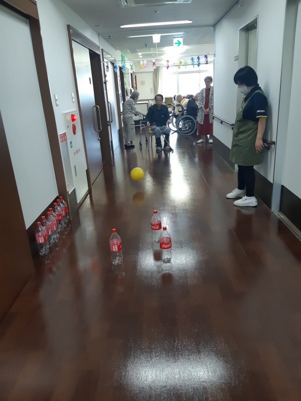 本日の3階では、ジュースの空きペットボトルを使用したボーリングレクを行いました!