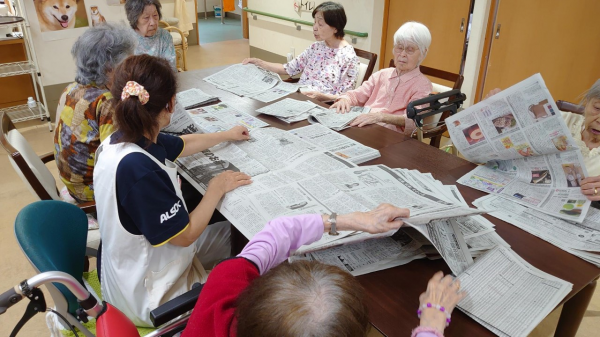 スタッフの新聞折を見ると入居者様が「私にもやらせて!」