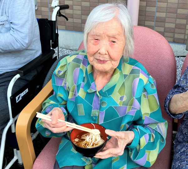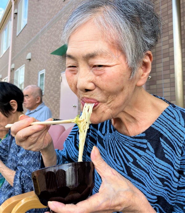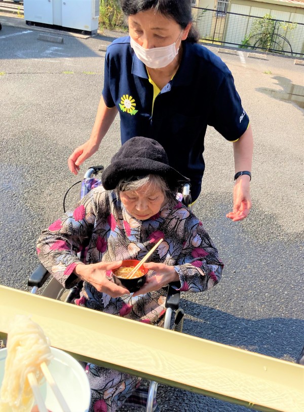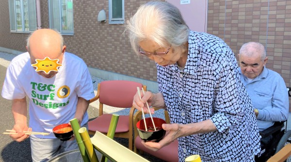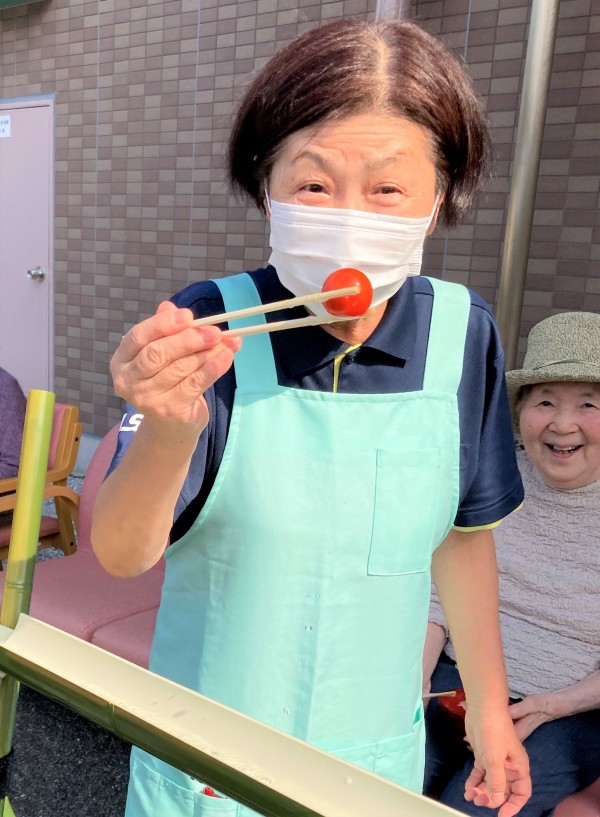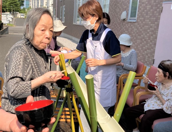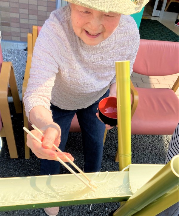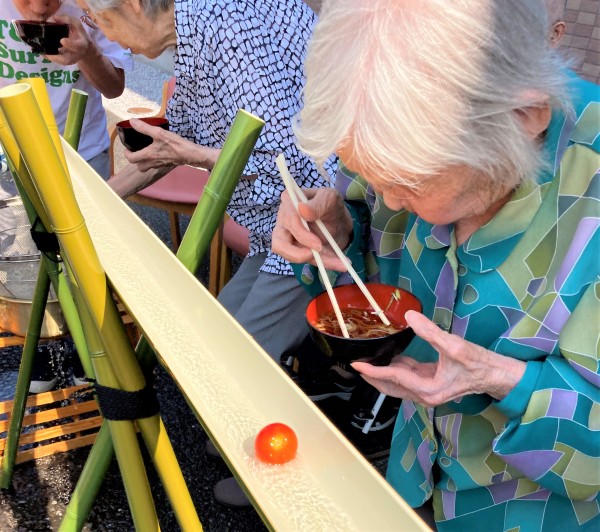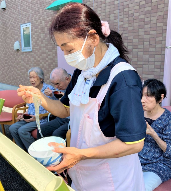 腰痛でベッドから起き上がる気力が湧きづらい西フロアーのS様ですが、流しそうめんと聞いて「行きます」と即答されました!(*^^*)
