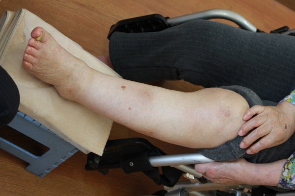 施術前の右足です。普段日中はほとんど車椅子での生活で、自走で移動して頂いて居りますが膝を曲げたり、伸ばしたりが出来ない為浮腫がひどく足首のくびれが分からない位で、圧縮マッサージ機や弾性包帯なども使ってみましたが、ご本人が嫌がれるため、今回シニアセラピーの施術をして頂きどんな効果が得られるか体験しました。