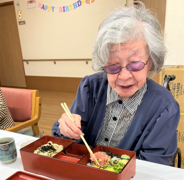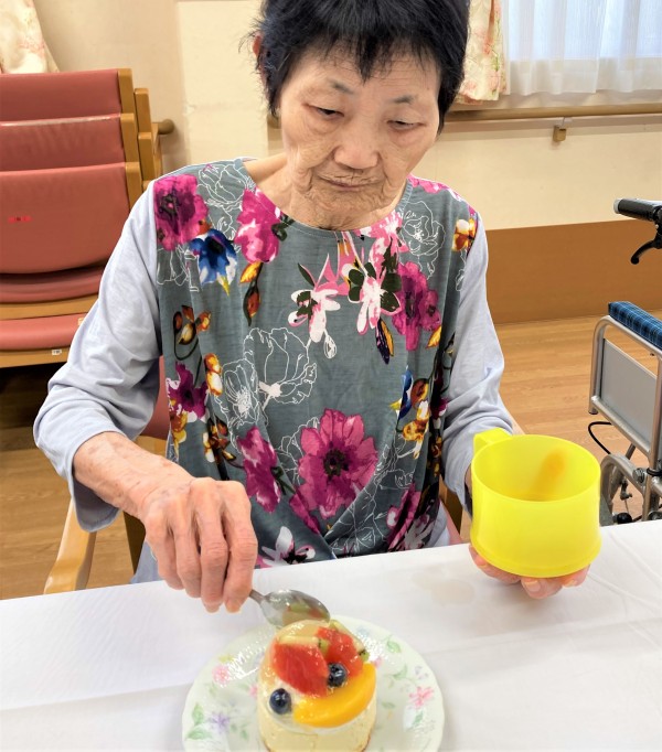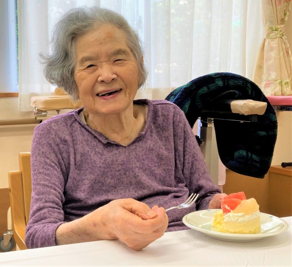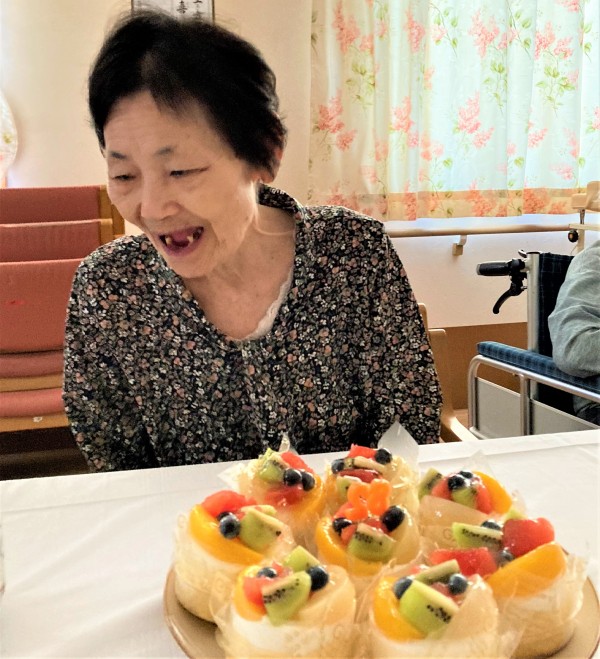 入居者様とスタッフで『♪ハッピーバースデーS様♪』と歌うと、S様はにかみながら「ありがとう!ありがとう!」と律儀にお返事くださいました♪
