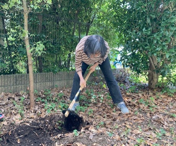 職員が一生懸命土を掘り起こしていると