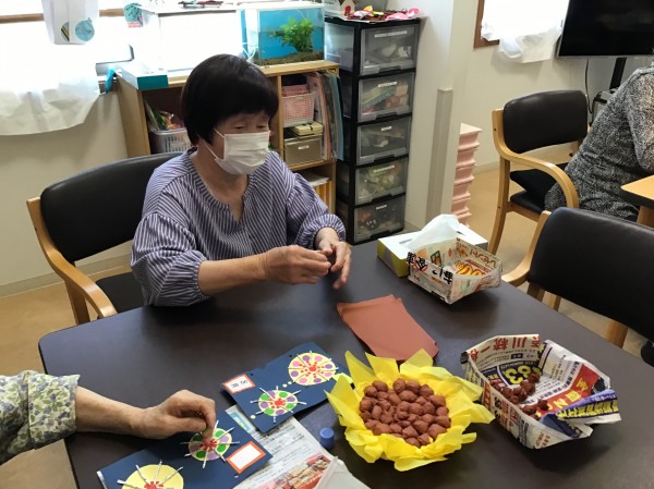 前回の壁画は紫陽花でしたが、夏!ということで、利用者様にひまわりを作っていただきました。