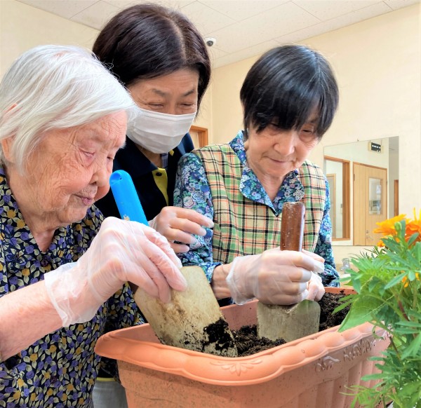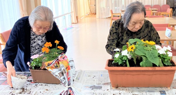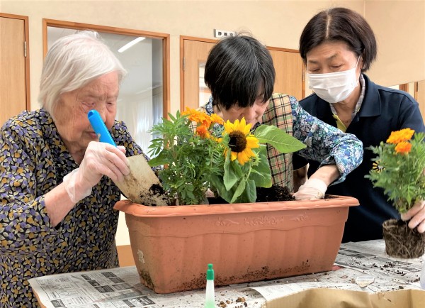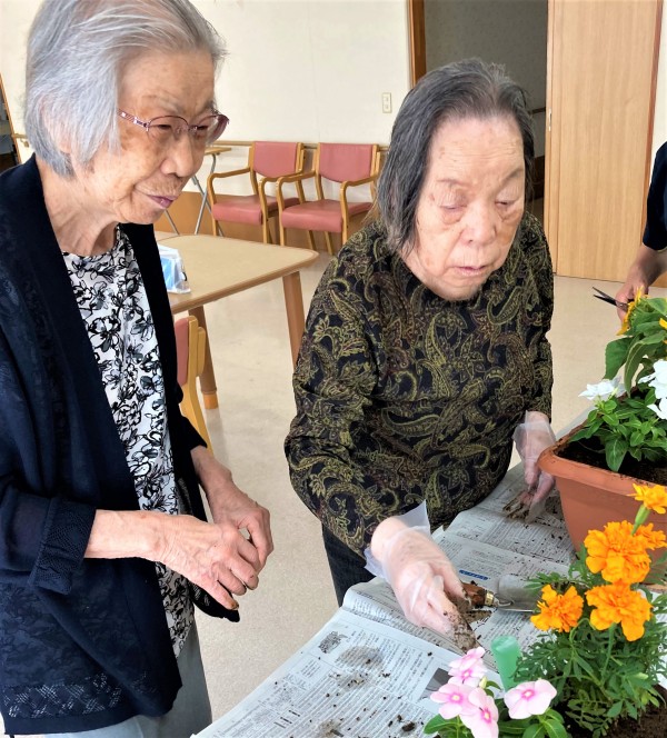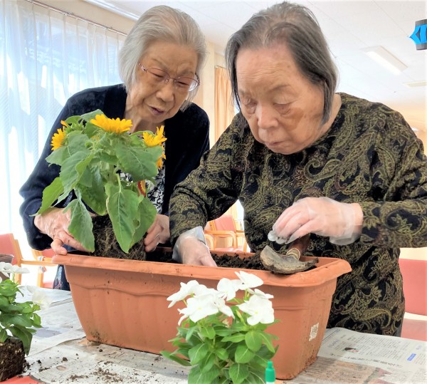 職人気質のI様は黙々と、お話好きなS様は「大きく育てよー」とお花に語り掛けながら作業されていました。