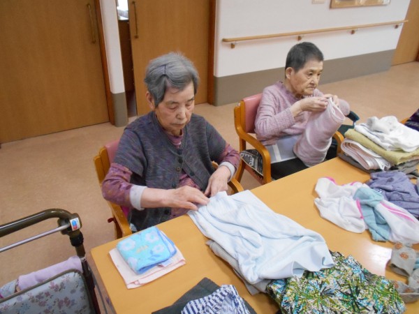 洗濯物を乾かした後、入居者様に畳むのを手伝っていただいています。