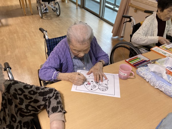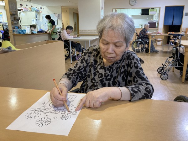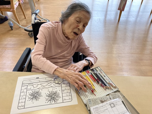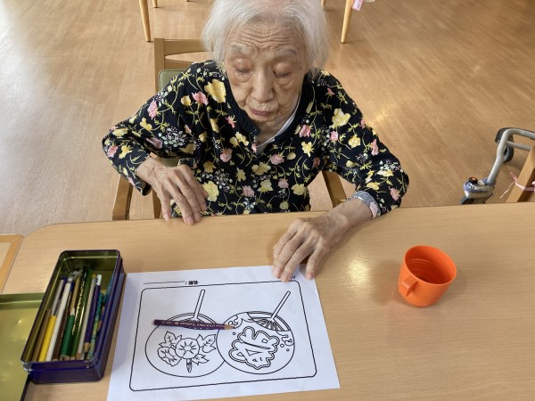 夏祭りに向けて、今回は夏まつり用の塗り絵をして頂きました。