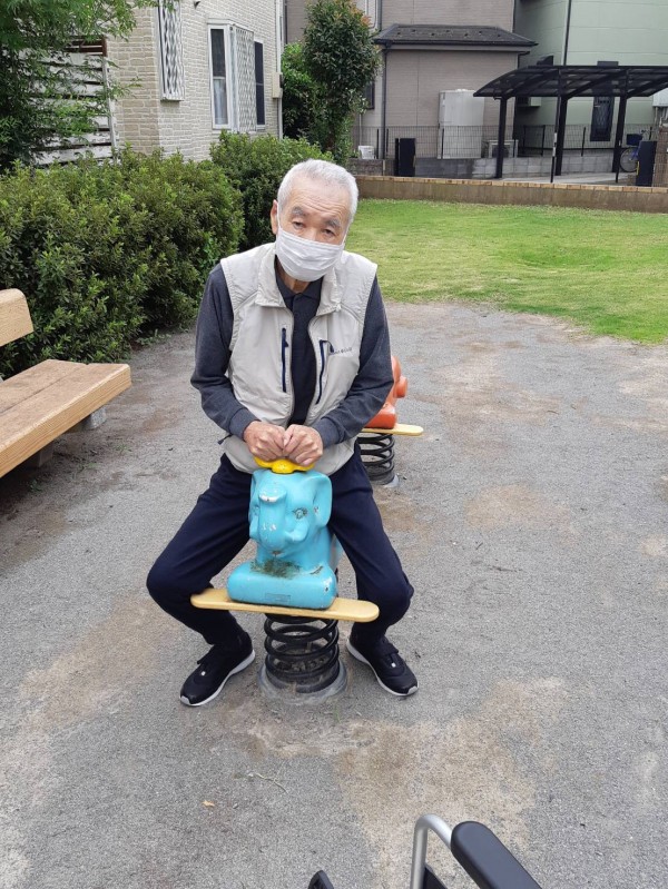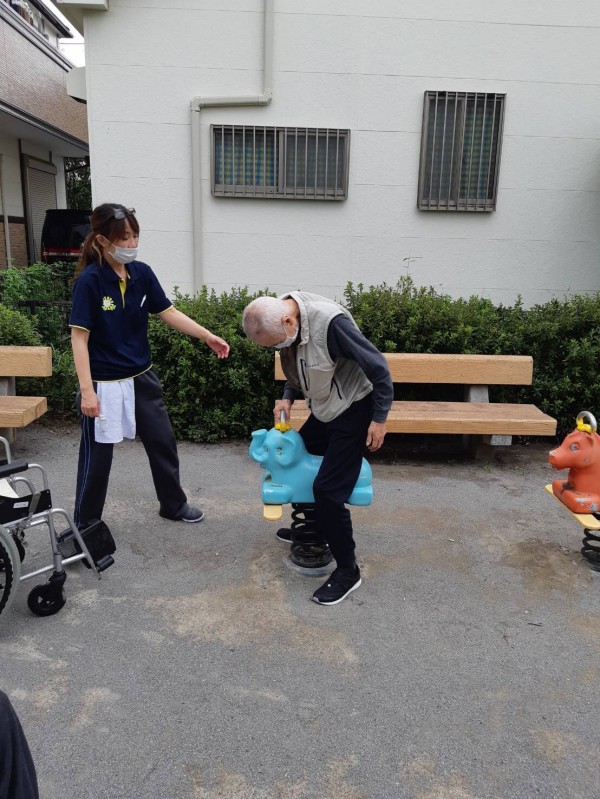 M様、突然車椅子から立ち上がり、ゾウの乗り物にまたがりゆらゆら遊びだし、それにつられてもう一人のM様は後ろの馬にまたがりにっこり。