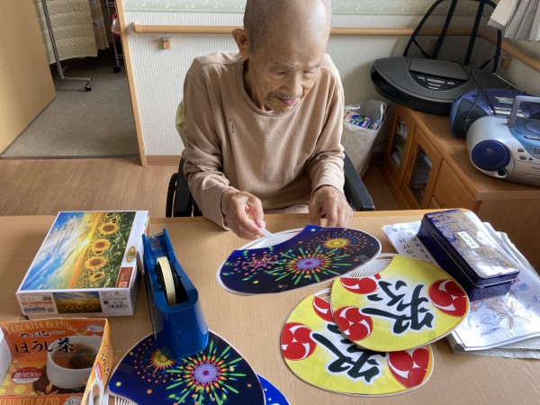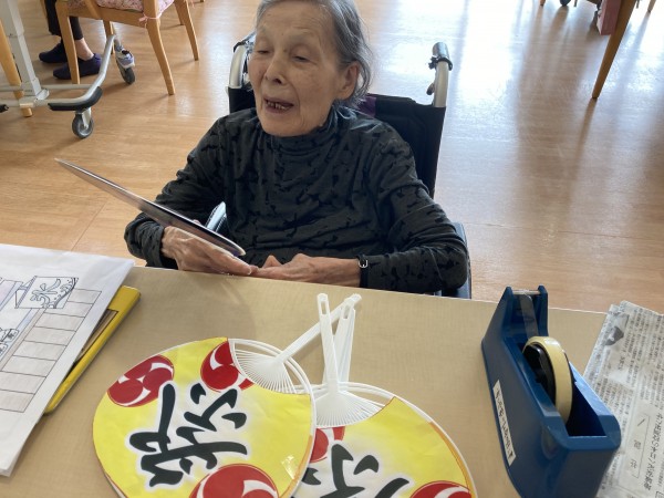 うちわに夏祭りの絵の入ったのを、貼り付けました。
