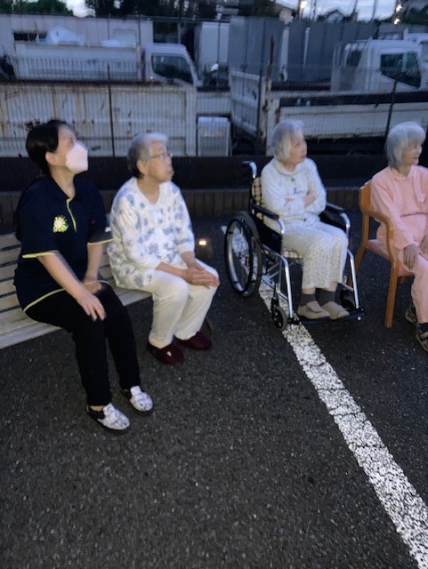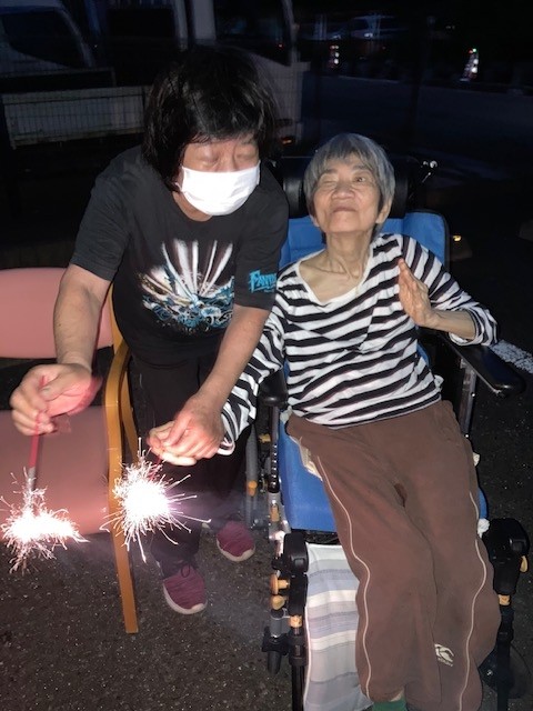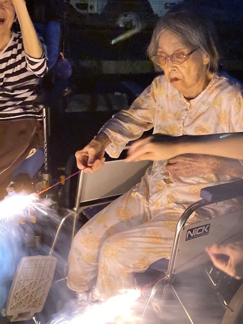 手持ち花火では花火を持つことを怖がる利用者様もいましたが多くの利用者様は「綺麗!綺麗!」と話され喜ばれていました。