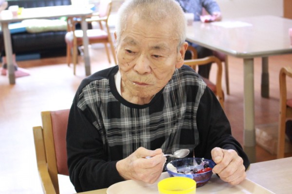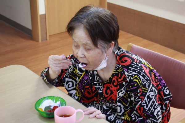 盆踊りに参加した後のおやつ、特性フルーツパフェ、中身は、アップルゼリーに、イチゴ、マンゴー、ブルーベリー、バニラアイス、ホイップクリームで飾り付けのパフェです。