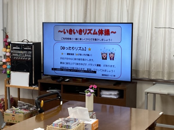 本日は、DVDを見ながら、ご入居者様も職員も一緒になって「いきいきリズム体操」を行いました\(・ω・\)