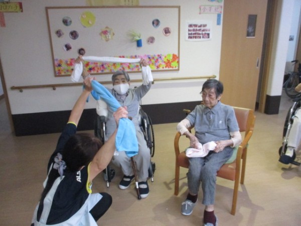この体操も3回目の取組で、ご利用者様もタオルを使った