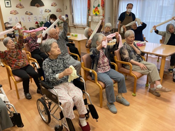 タオルを結んで玉を作ってから脚を挙げて下から通したり、思いっきり腕を伸ばすストレッチや、上に投げてキャッチなどレクリエーションの要素もあり工夫がたくさん詰め込まれたメニューでした♪リフレッシュして頂けましたでしょうか?