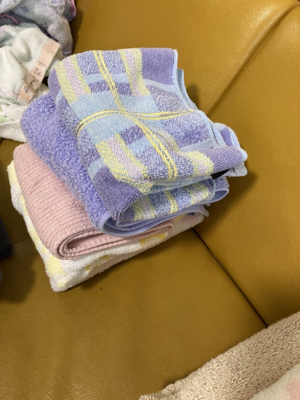 乾燥機かけおわり、後程皆様にたたんで頂こうとソファーに置いておいたら。