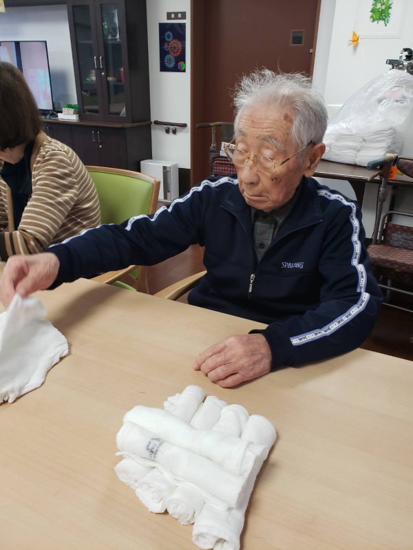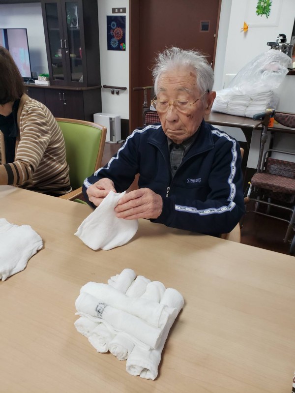 先日3階の入居者様が【お絞り作り】を手伝って下さいました(*^^*)