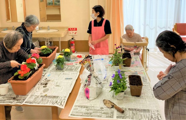 ということで今月も園芸クラブのお時間となりまして、今回は園芸クラブ玄人の西フロアーのⅠ様とO様1階フロアーのH様とI様の4名様にご参加いただきました(*^^*)