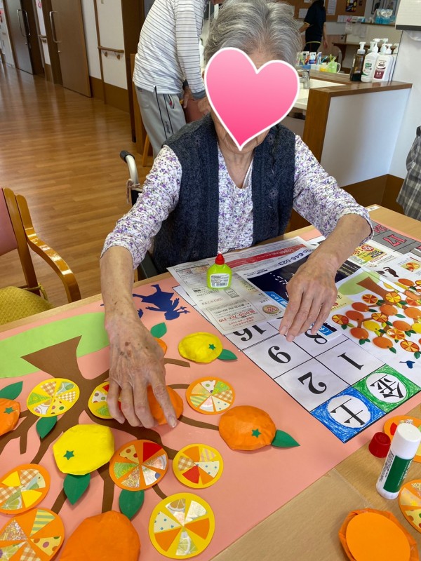 ◉先日作った『みかん』と『輪切り』を、模造紙にバランスを考えながら配置していき、糊付けしていく。