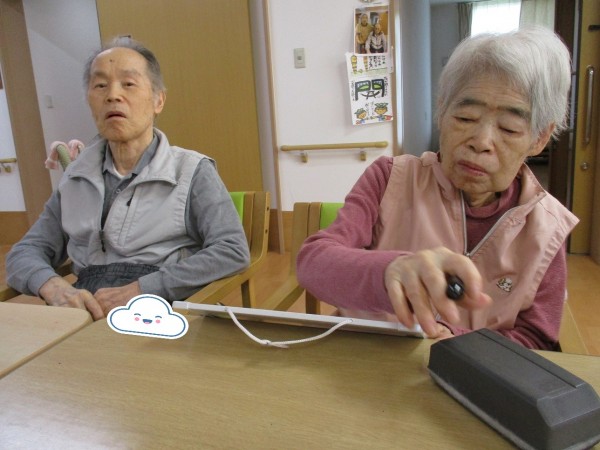 ホワイトボードで筆談したり手を触ったり