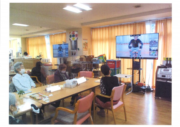 当社オリジナルのNõAエクササイズのご様子です(*^^*) この日は、大画面テレビを使って他のデイサービスと一緒にリモートで行いました。 本社の岡田先生の指導で楽しく運動しました♪ 他のデイサービスの様子も見れましたね(⌒∇⌒)