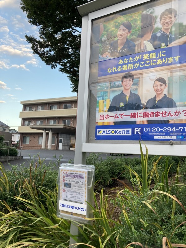 介護付有料老人ホームみんなの家・南中野の外部掲示板の下にチラシを設置しております。