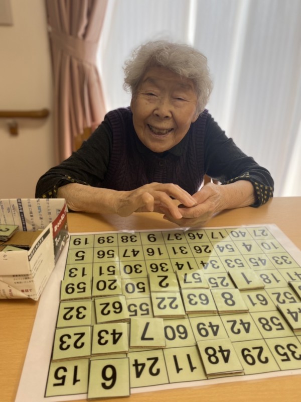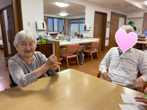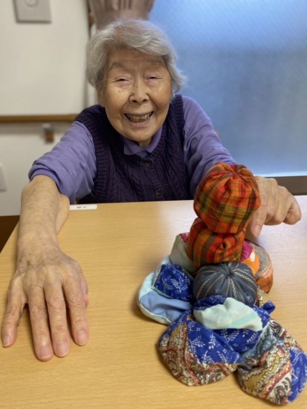◉スタッフに『お手玉』の遊び方を教えてくださる女性入居者様。