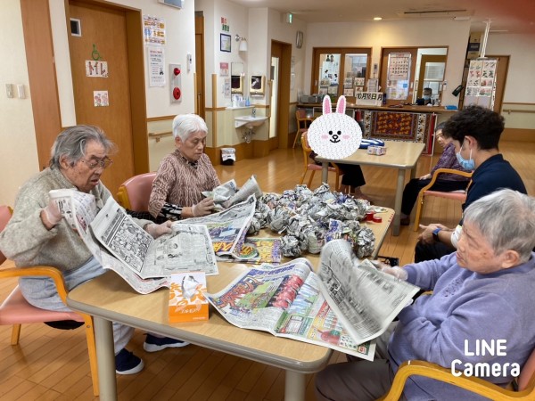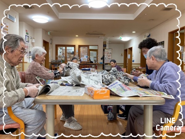 新聞紙を入居者様に丸めてもらい私がテープで止めての協力して頂き沢山出来ました。
