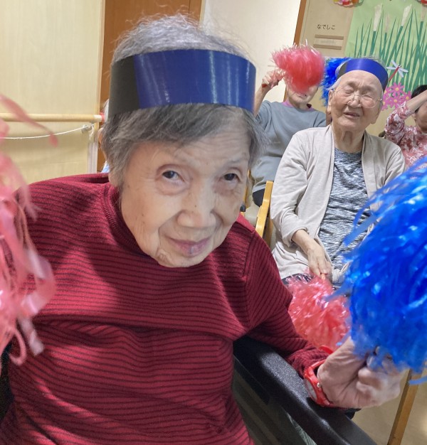 このゲーム、お題を出す人はひっかけようとするので間違えそうな気がしますが、結構皆さん間違えないんですよね。秘訣は鏡。ご利用者様には右手に赤、左手に青をもってやっていただいていますが、テレビ画面の中のインストラクターや前に出たスタッフは右手に青、左手に赤と皆様と逆に持っています。ご利用者様に分かりやすい様に、という事なんですが、皆さまは声を聞いてというより前のスタッフの真似をして旗をあげているようなんです。これだって難しそうですが皆様結構しっかりと前の動きに反応して旗を上げ下げされています。脳がばっちり働いている証拠なのかなって思います。