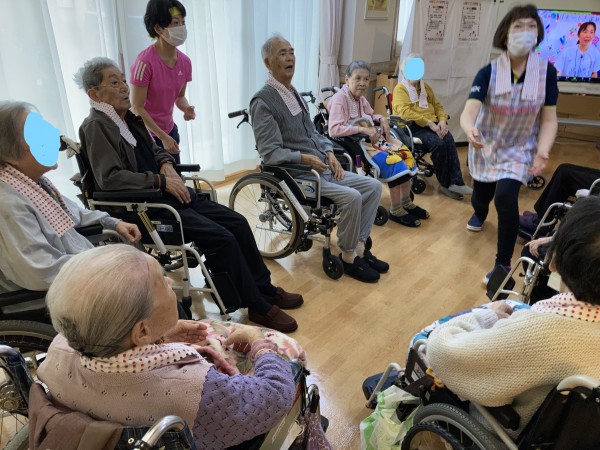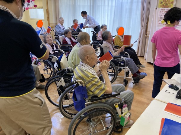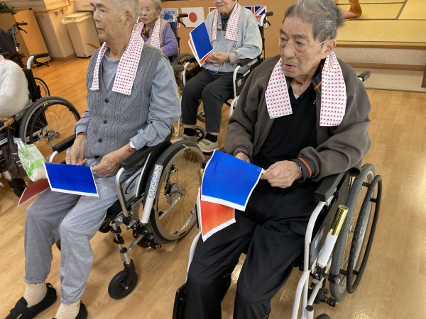 皆さん、手作りの旗を持ち、インストラクターの先生の声かけにて、