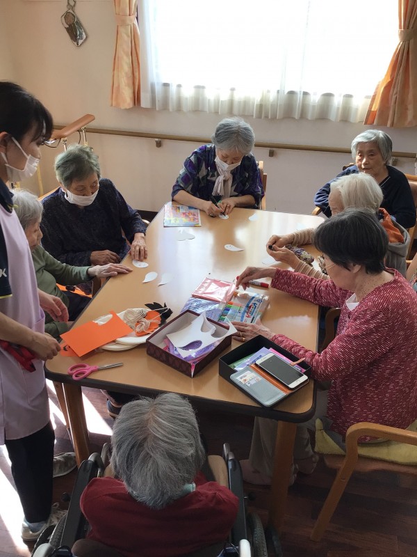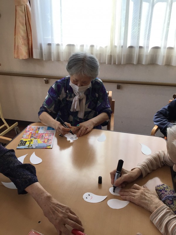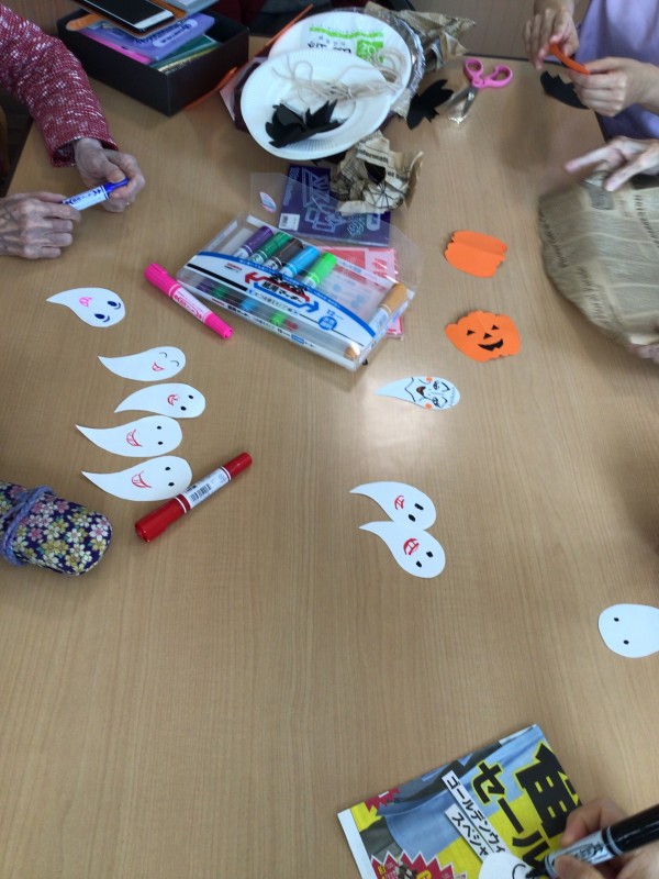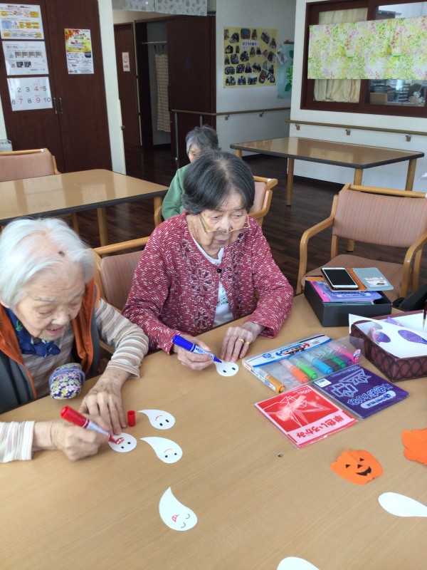 入居者様の年代にはあまり馴染みがない最近のお祭りですが、皆さん楽しく飾りつけをして下さいました。
