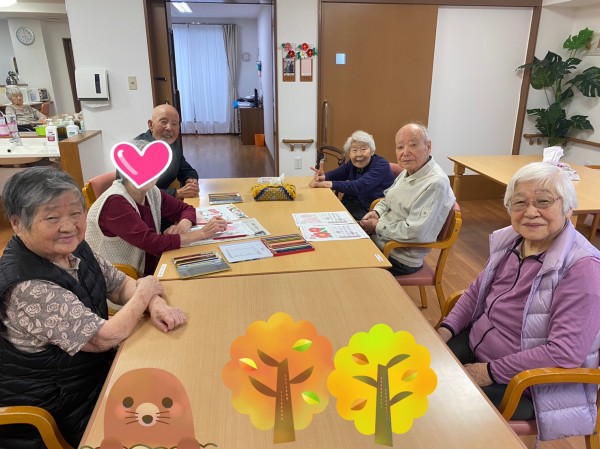 さて二階フロアでは、様々な『パズル』に取り組まれたり、『季節の塗り絵』に集中されたり、同席の方々と会話も弾まれ、賑やかなご様子でした。