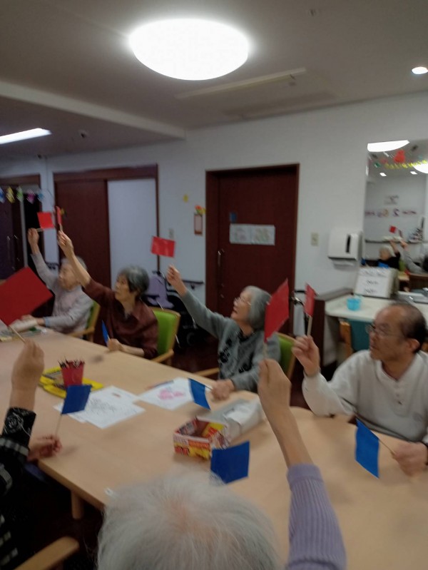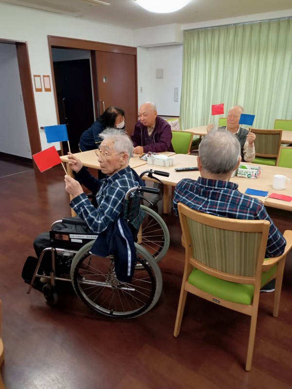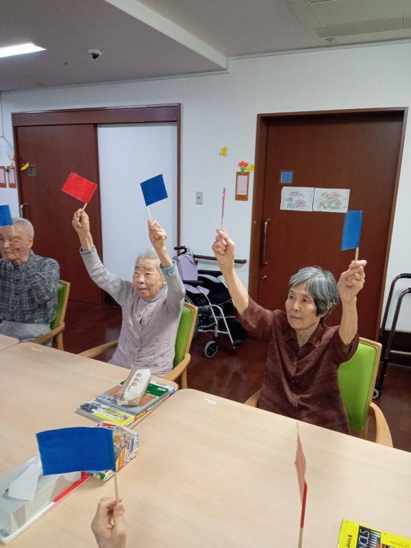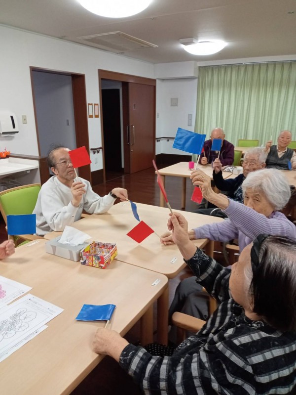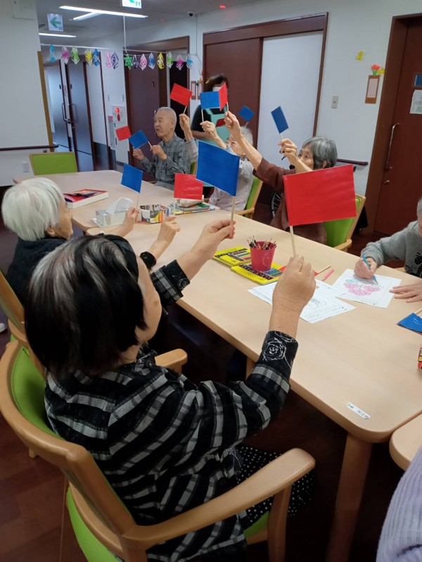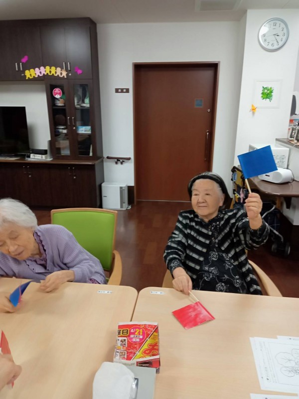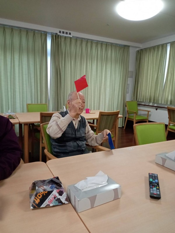 右手に赤、左手に青の旗を持って手と頭の運動です(^o^)
