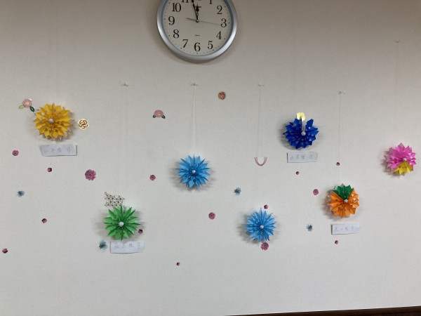 折り紙を折ってハサミでひと手間加えて完成ですが、ハサミの作業は細かく危険ですので職員がフォローに入っています。