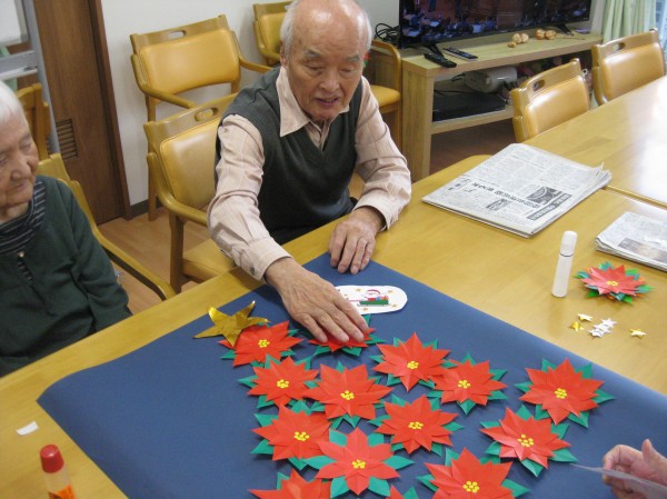 季節のお花ポインセチアでクリスマスツリーの貼り絵を作成しました☆