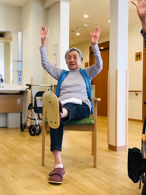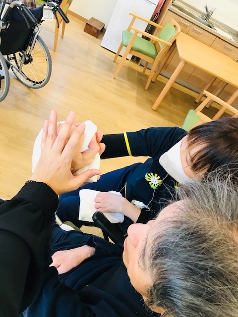 体操動作がタオルを使うものだったため、スタッフが隣に座りその方のもう一つの手となり一緒に体操。